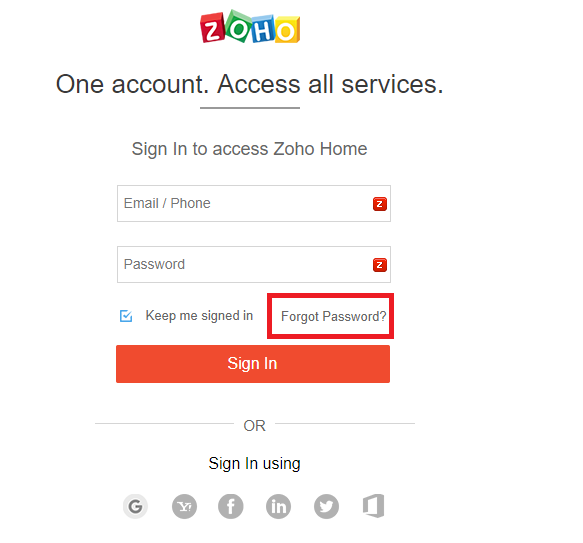 - Click the Forgot Password link in the Log in page of Zoho Recruit, the system redirects you to Zoho Accounts page.